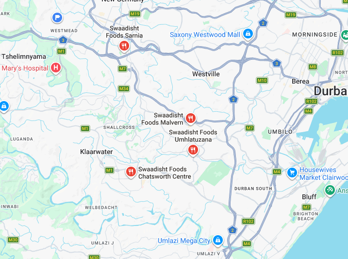 Swaadisht Foods (often just called Swaadisht) is a popular Indian restaurant chain in the Durban area, known for its extensive menu of over 120 dishes and for being crowned the city’s Bunny Chow champs by many locals. Bunny chow — Durban’s iconic street food of a hollowed-out loaf of bread filled with spicy curry — is one of their signature items, and they get frequent praise for it.
